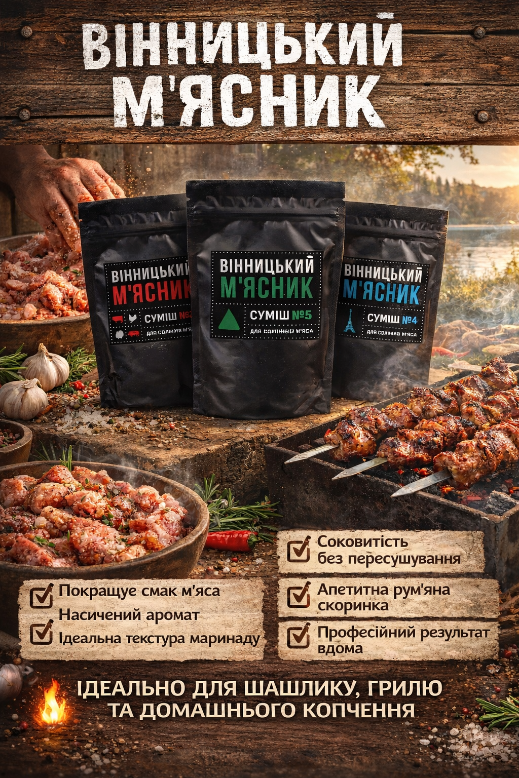 Підходить для шашлику, гриля, копчення та домашніх м’ясних виробів.