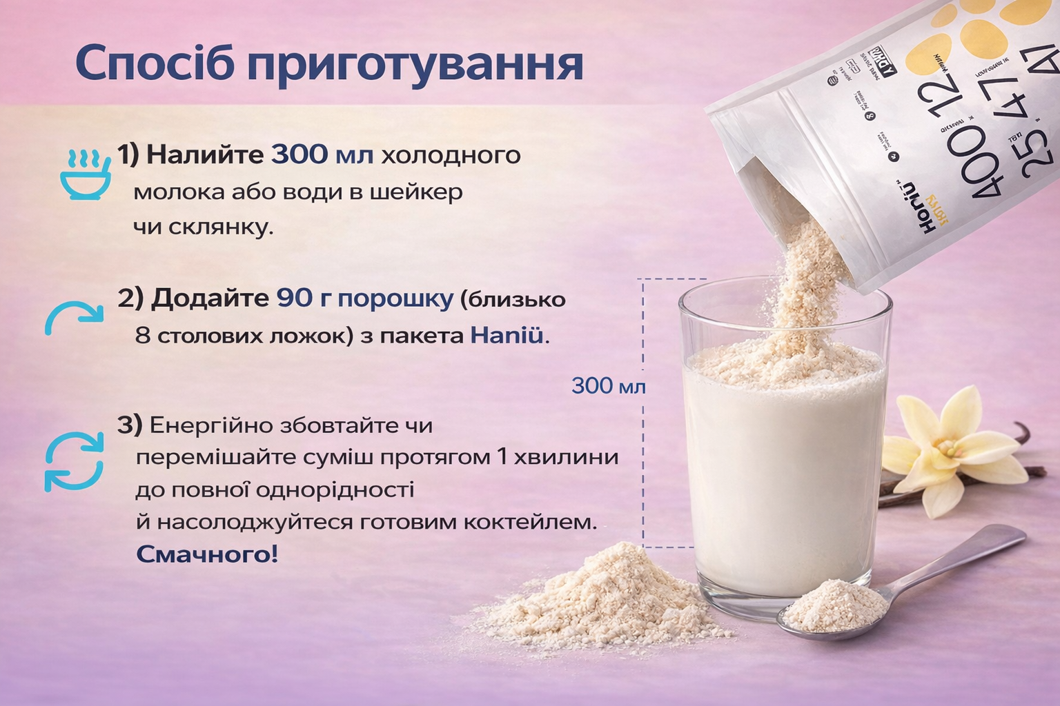 1) Налийте у ємність з Напоєм 300 мл холодного молока або води