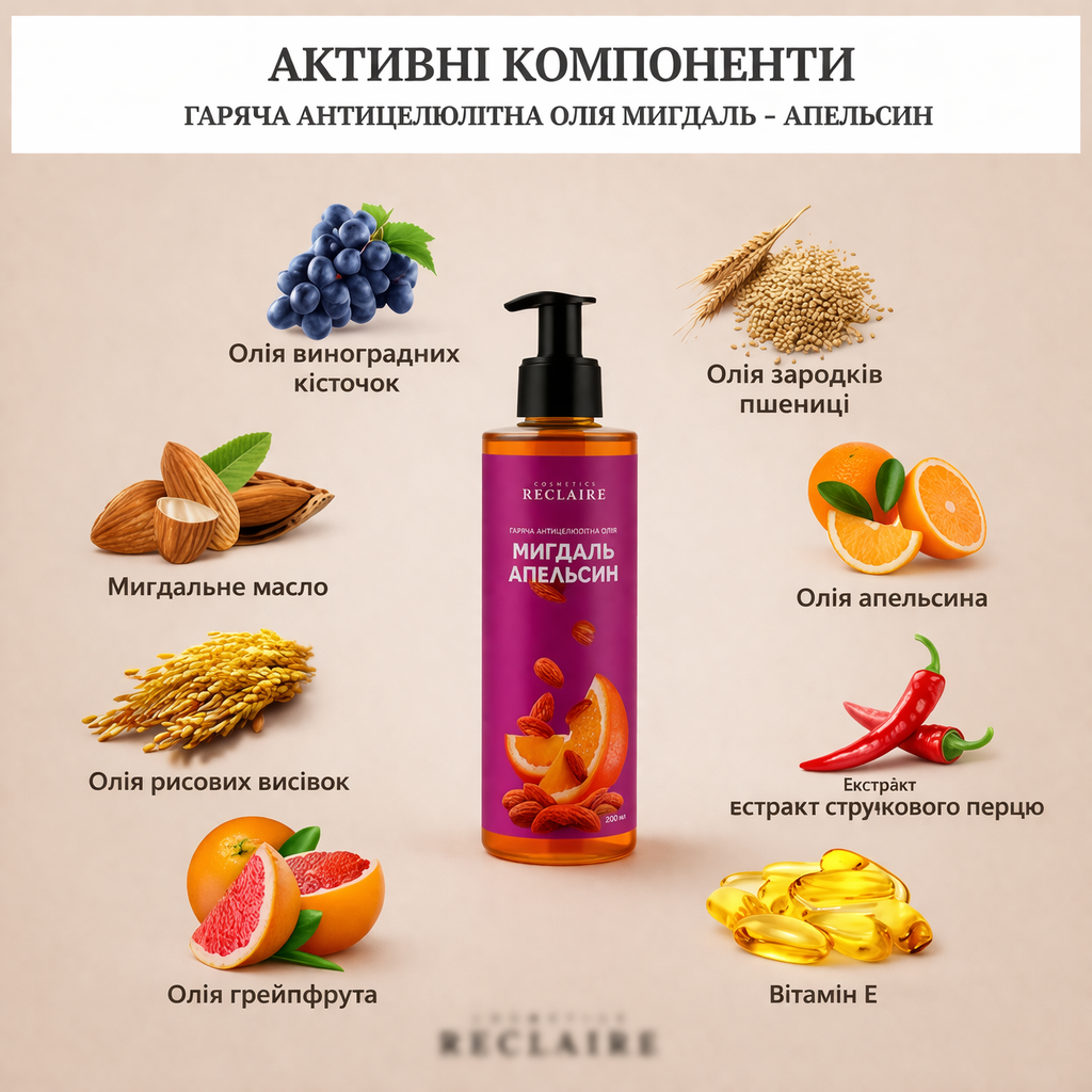 Гаряча антицелюлітна олія “Мигдаль-Апельсин” призначена для догляду за шкірою та покращення її тонусу. Формула з активними компонентами сприяє посиленню мікроциркуляції, допомагає зробити шкіру більш пружною та еластичною.