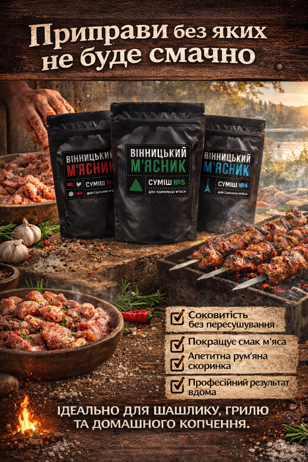 Підходить для шашлику, стейків, ковбас, гриля та домашнього копчення.
